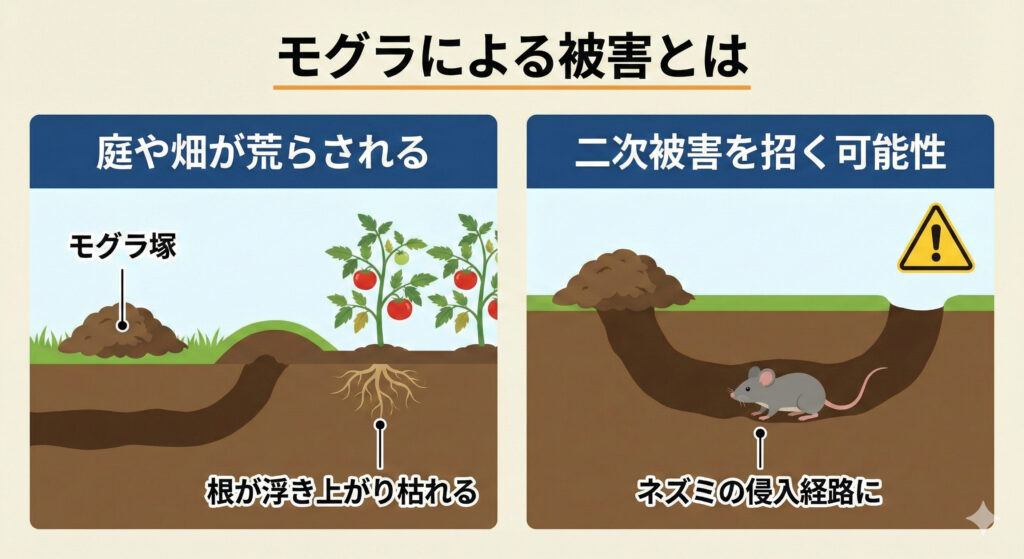 モグラは直接作物を食べる害獣ではありませんが、地中を掘り進める習性があるため、結果的にさまざまな被害を引き起こします。まずは、どのような影響が出るのかを理解しておきましょう。
