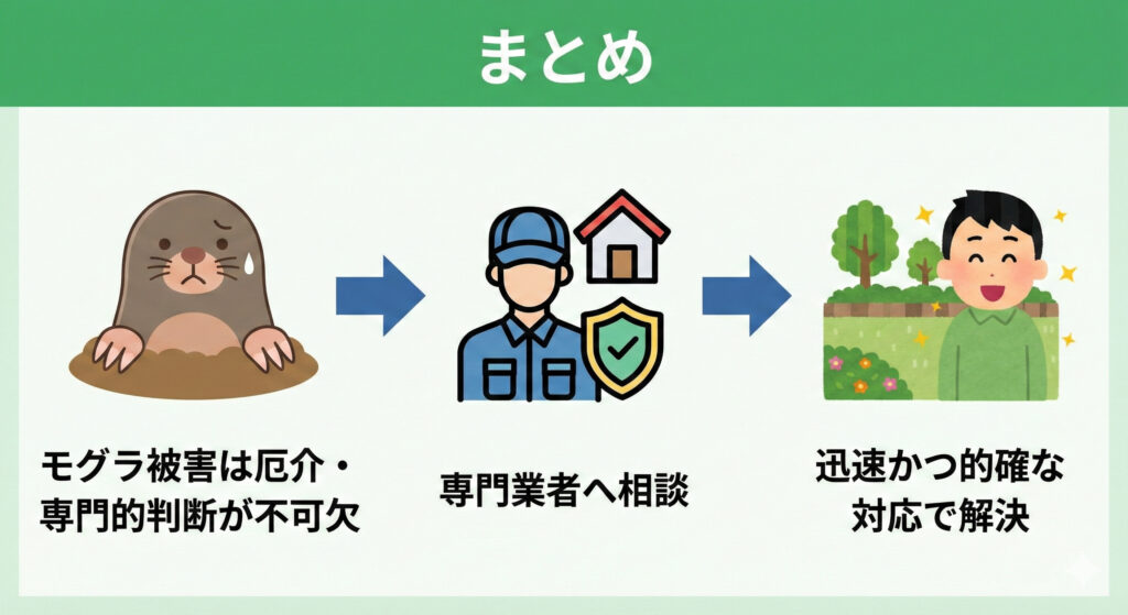 モグラは鳥獣保護管理法の対象となる地域があり、捕獲や処分には制限が設けられている場合があります。許可なく捕獲・駆除を行うと、法律違反となる恐れがあるため注意が必要です。 また、強力な薬剤や誤った方法で忌避処理を行うと、土壌汚染や地下水への影響、人やペットの健康被害につながる可能性も否定できません。安全性を確保するためにも、使用方法や成分を十分に理解した上で対策を行うことが重要です。まとめ