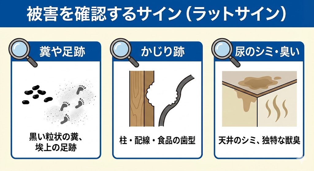 小さな黒い粒状の糞や、埃の上に残る小さな足跡があれば要注意です。ネズミは通い慣れたルートを繰り返し使うため、同じ場所に痕跡が残りやすいです。