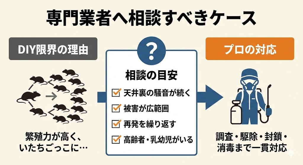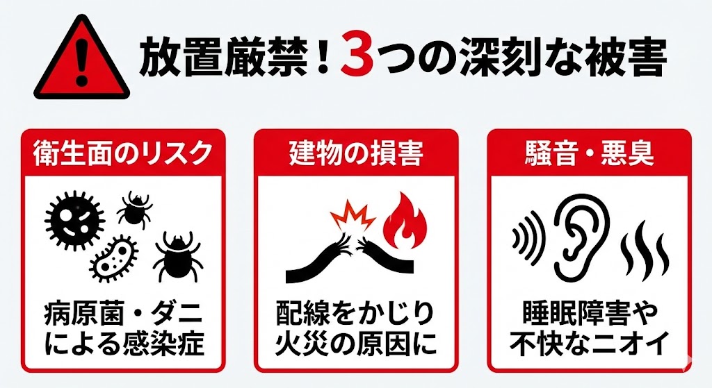 ネズミ被害は放置するほど被害が拡大し、建物の損傷や健康リスクにつながります。 「音がする」「糞を見つけた」と感じたら、すぐに駆除の準備を始めてください。