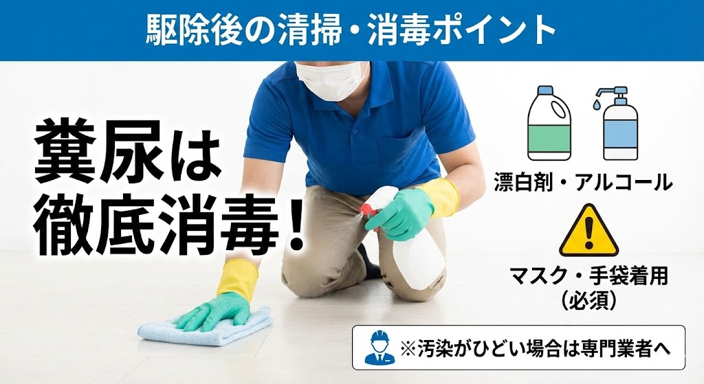 駆除後は、ネズミがいた場所を必ず清掃・消毒します。 糞や尿には細菌や寄生虫が含まれるため、マスクと手袋を着用し、漂白剤やアルコールでしっかり拭き取りましょう。断熱材や天井裏の汚染がひどい場合は、専門業者に撤去・除菌を依頼するのが安全です。