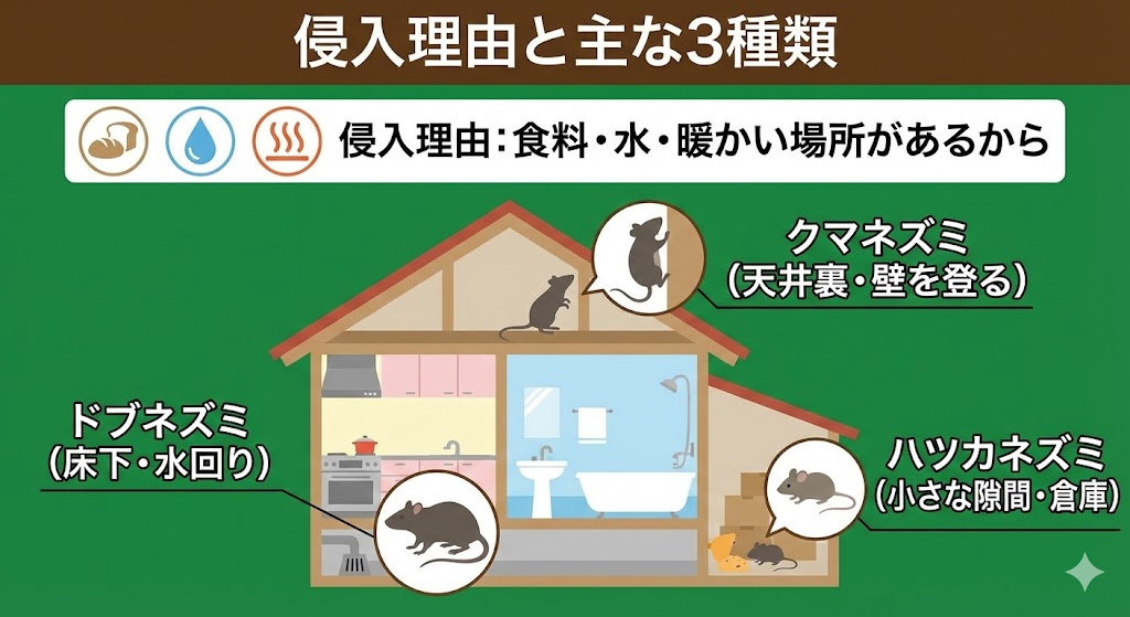 ネズミは人間の生活環境と非常に相性のよい動物です。食料・水・暖かい場所の3つがそろう住宅は理想的な棲みかとなります。