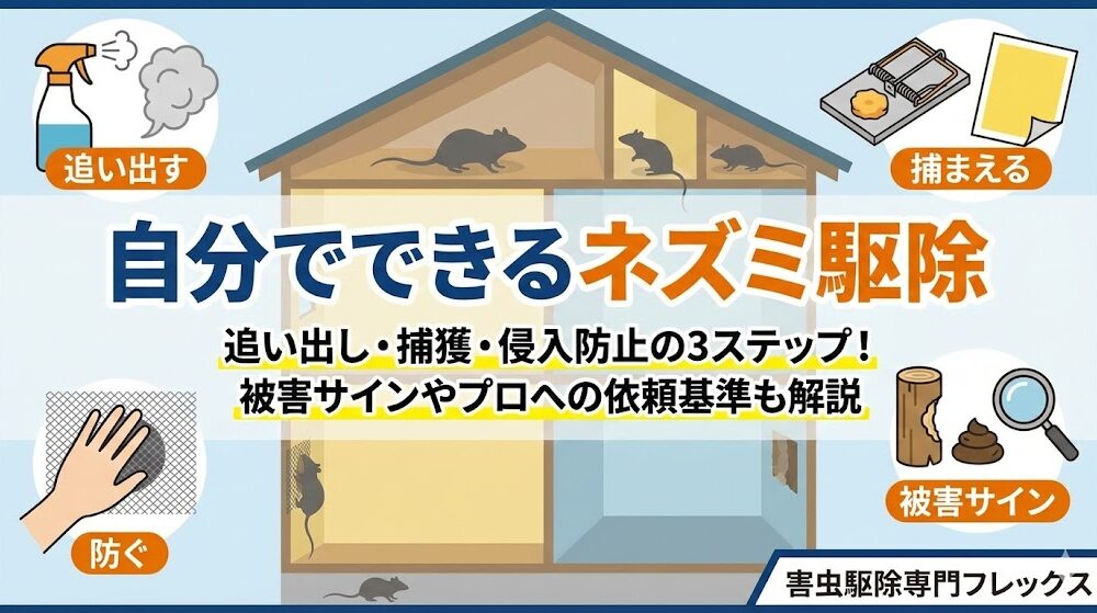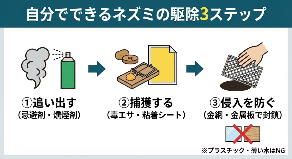 ネズミの駆除は「追い出す」「捕まえる」「侵入を防ぐ」という3つの段階に分けて考えることが大切です。