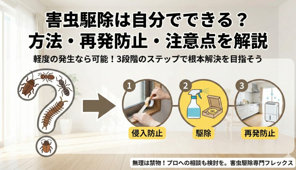 害虫駆除は、軽度の発生であれば自分で対処することも可能です。ただし、侵入経路を塞ぐ → 室内を駆除する → 再発防止策を徹底するという流れで段階的に進めることが大切です。目の前の虫を退治するだけでは、根本的な解決にはなりません。