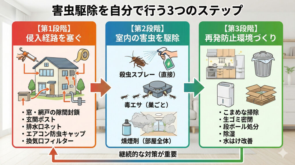 目の前の虫だけを退治しても、再発するケースは少なくありません。確実に対処するには、次の3段階で進めましょう。