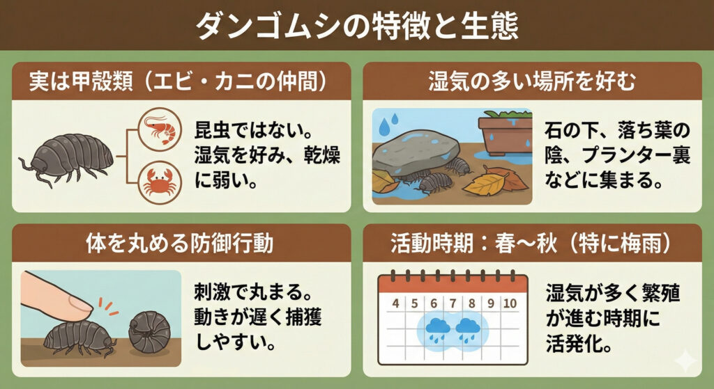 ダンゴムシ対策を効果的に行うためには、やみくもに薬剤を使うのではなく、生態や行動パターンを理解することが重要です。「どこに集まり、なぜ増えるのか」を知ることで、無駄のない駆除と予防が可能になります。まずは基本的な特徴を押さえておきましょう。