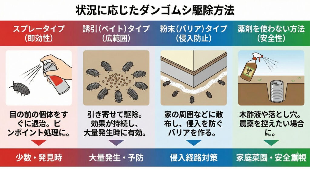 状況に応じて方法を選ぶことが重要です。数匹なのか、大量発生なのかで対策は変わります。