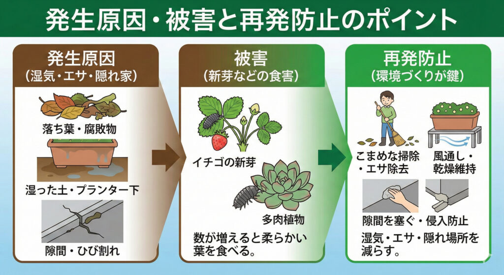 ダンゴムシは一度駆除しても、環境が整っていれば再び集まってきます。そのため、目の前の個体を退治するだけでなく、「発生しにくい環境づくり」まで行うことが根本対策になります。湿気・エサ・隠れ場所の3つを減らすことが、再発防止の基本です。日常的にできる対策を積み重ねることで、長期的な予防効果が期待できます。