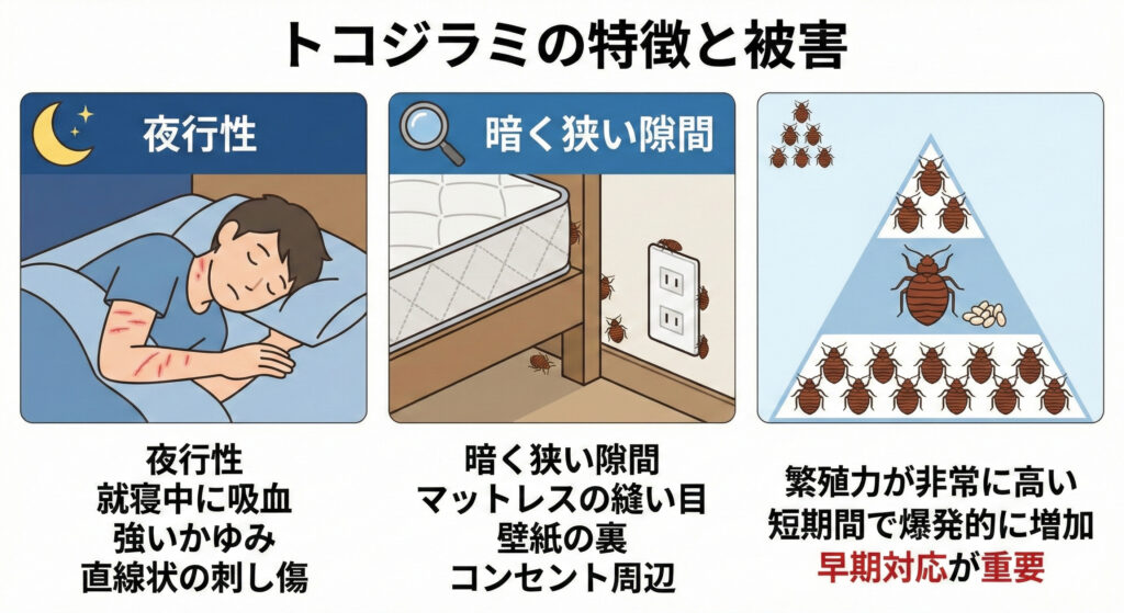 トコジラミは夜行性で、就寝中に吸血します。腕や首、足など露出している部分が狙われやすく、複数箇所を直線状に刺されることもあります。強いかゆみが数日続くケースも珍しくありません。