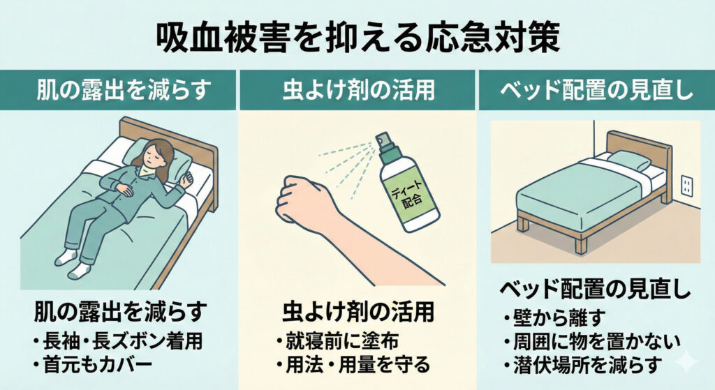 駆除と並行して、吸血被害を減らす対策も重要です。