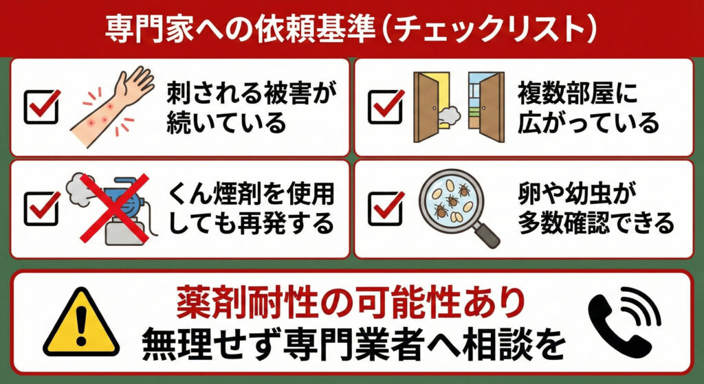 トコジラミは薬剤耐性を持つ個体も増えており、一般的な市販薬では完全駆除できないケースもあります。
